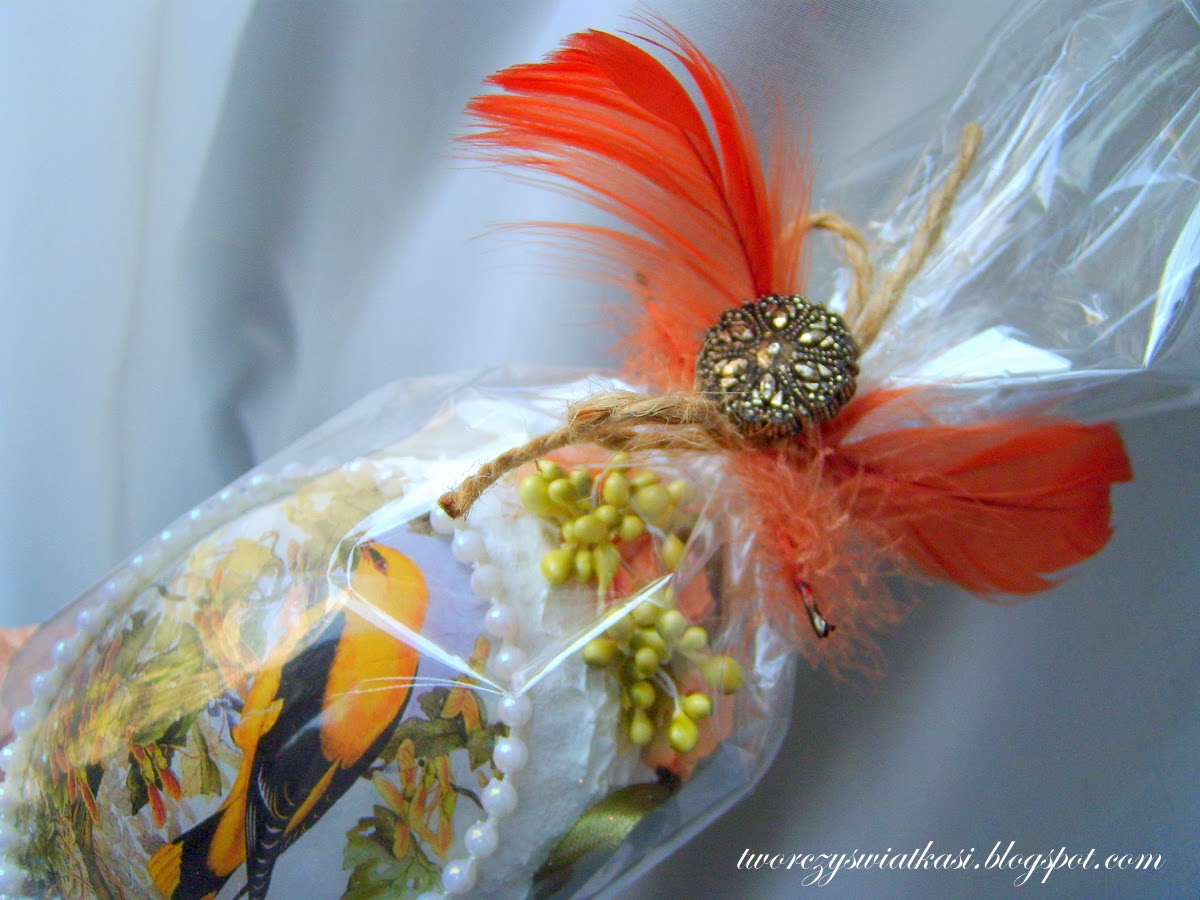 Pokusiłam się o decoupage na akrylu i przyznam, że nie było łatwo. Zniszczyłam jeden motyw, który miał zdobić jajo, ale nie poddałam się i sięgnęłam po inny, choć już nie tak piękny. Dodatkowo pokryłam jajo matowym żelem do akryli, potapowałam białą farbą i obsypałam brokatem. Dokleiłam perełki i kwiatuszki.