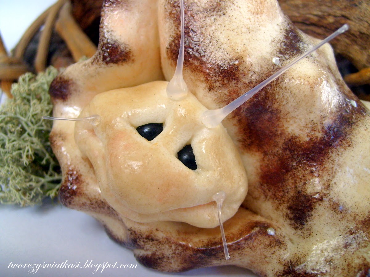 OdpowiedzUsuńTwój ślimaczek ma to coś co powoduje, że ...pojawia się uśmiech na twarzy. Jest genialnie wykonany, fenomenalnie przedstawiony i uroczo się...prezentuje. Te detale, te dodatki..SUPER!:)